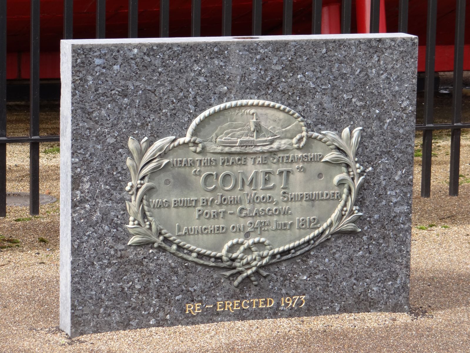 Comet Commerative Plaque – Original built by John Wood shipbuilder completed 1812 – owner Henry Bell Gives information of Comet paddle ship built in Port Glasgow